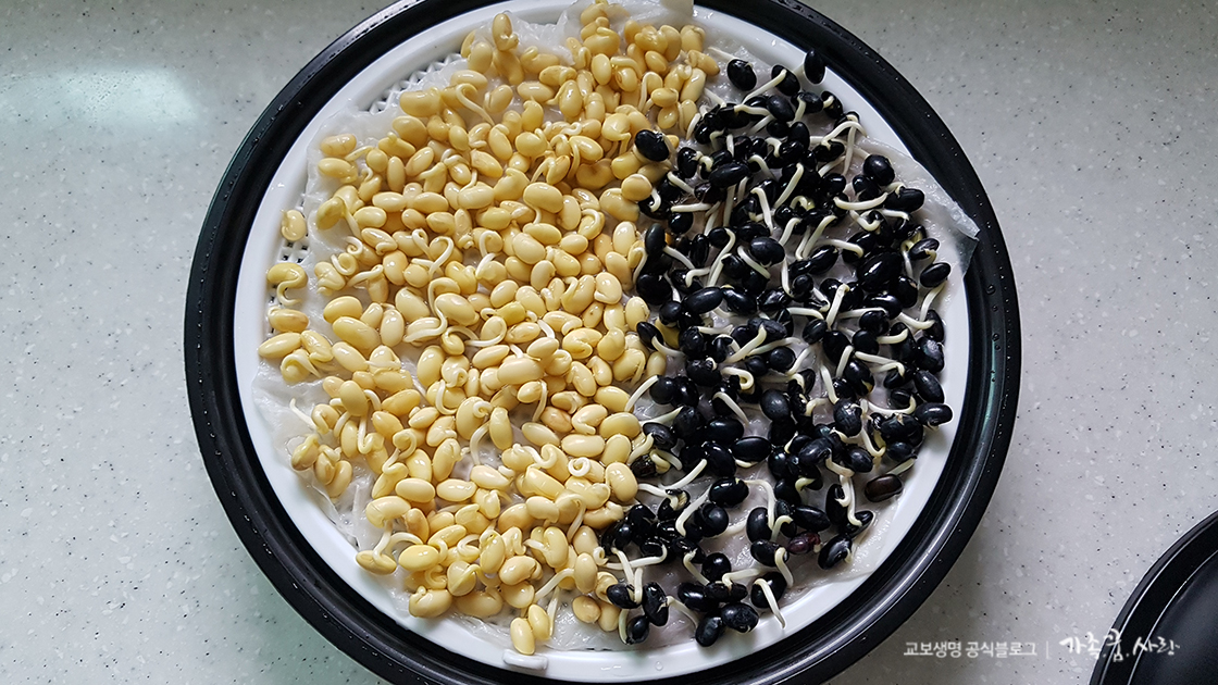 콩나물 콩과 재배기가 준비되었으니, 이제 본격적으로 콩을 물에 불려 볼까요? 설명서에는 실내온도 16~20℃에서 3~4시간 미지근한 물에 불려 주라고 나와 있는데요, 제가 직접 길러 보니 한나절 이상 불려 주면 발아가 더 잘 되는 것 같았어요. 잘 불려진 콩을 자세히 살펴보면 금방이라도 싹이 튀어나올 것만 같은 느낌이 듭니다.