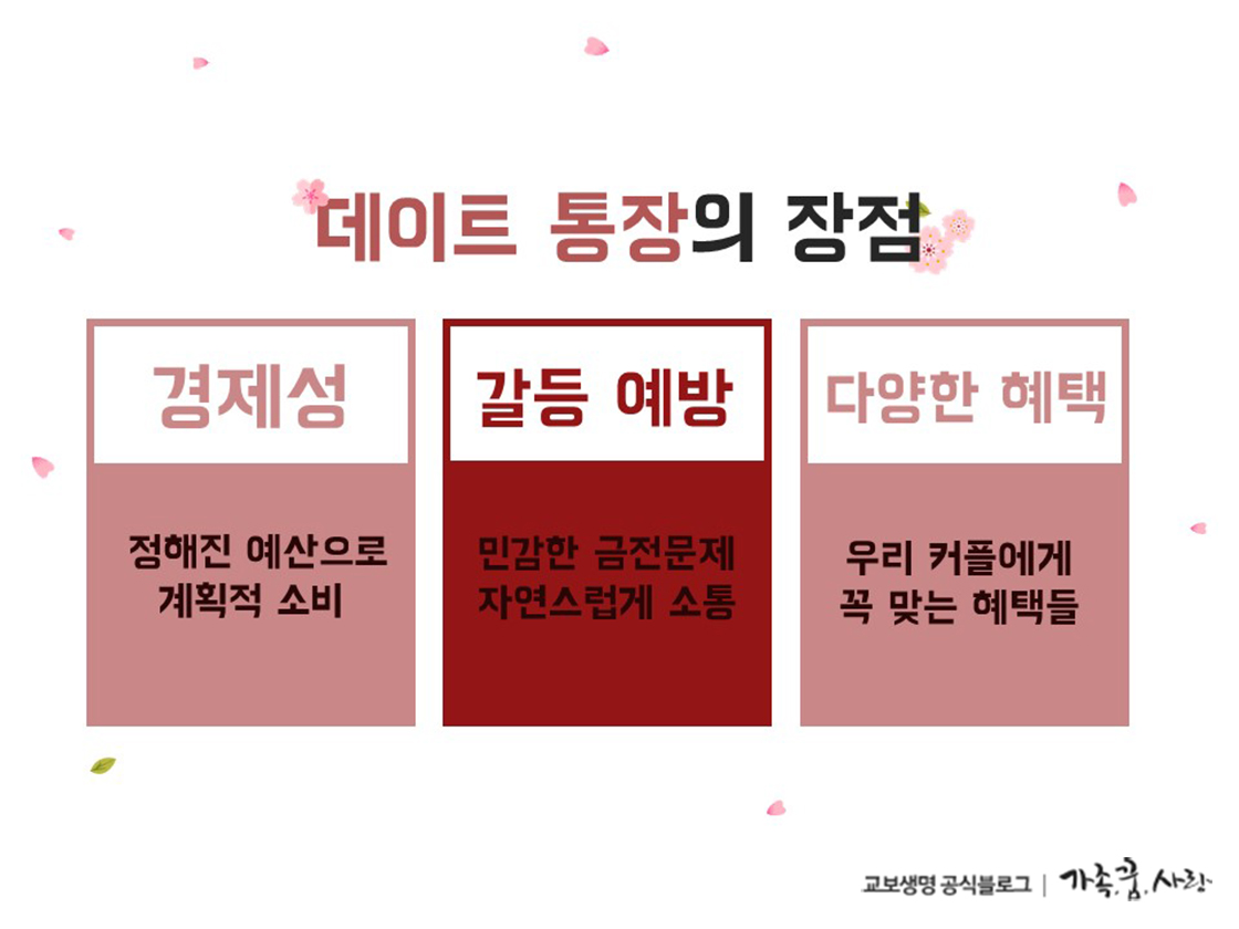 데이트 통장의 장점은 크게 세 가지로 나누어 볼 수 있습니다. 첫 번째로 경제적입니다. 데이트 통장을 사용하면 형편에 맞고 제한된 예산 내에서만 소비를 하게 되기 때문에 과소비를 막을 수 있죠. 또 데이트할 때의 소비 경향을 한 눈에 확인할 수 있어 계획적인 소비를 할 수 있습니다.