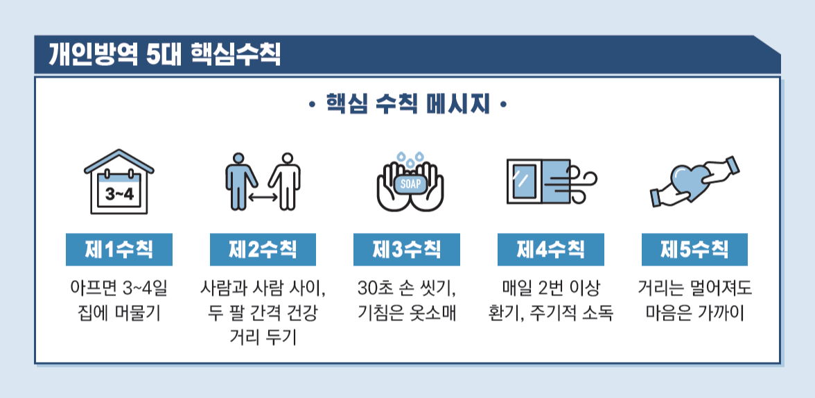 하루 수십명씩 발생하던 감염자가 한자릿 수로 떨어지면서 고강도 방역 활동이 성과를 보이자, 일상으로 돌아가되 예방활동을 여전히 지키며, 주의하자는 생활 속 거리 두기로 정부 방역 지침이 바뀌었습니다. 생활 방역 수칙은 5가지가 있는데 요약하면 ‘사람 간 만남을 최소화하고 손을 깨끗하게 씻으며, 혹 아프면 집에 머물자’입니다.