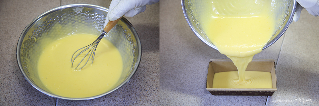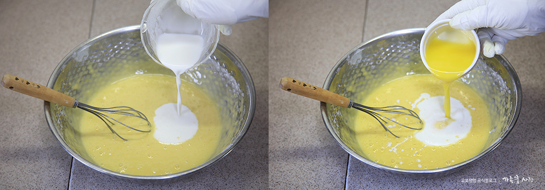 6. 5번에 생크림과 전자레인지에 녹인 버터를 넣고 잘 섞어 줍니다.