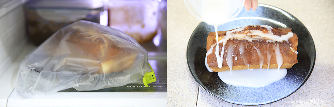 9. 구워진 파운드케이크는 한 김 식혀 밀봉한 다음 냉장고에서 숙성시켜 주세요. 냉장고에서 숙성의 시간을 가져야 더 부드럽고 촉촉한 파운드케이크를 맛볼 수 있어요. 냉장고에서 하루 숙성 시킨 레몬파운드케이크에 레몬 아이싱을 뿌려주면 레몬파운드케이크가 완성됩니다.