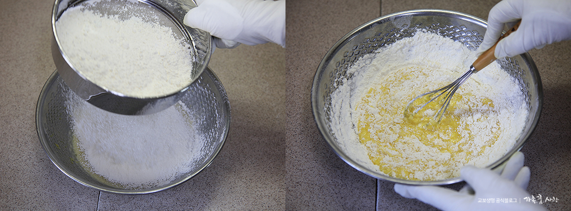 5. 4번에 박력분과 베이킹파우더를 체에 내려 넣고 골고루 섞어 주세요.