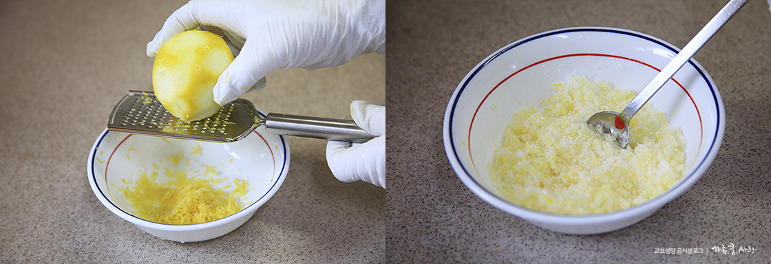 2. 레몬의 껍질을 가루처럼 가늘고 얇게 벗겨낸 것을 레몬제스트라고 하는데요, 레몬제스트를 만들어 반죽에 넣을 거예요. 깨끗이 씻은 레몬 껍질의 노란 부분만 돌려가며 치즈크레이터를 이용해 껍질을 갈아 주세요. 강판이나 필러를 이용해 한 번 더 곱게 다져 줍니다. (레몬제스트를 만들 때 껍질의 흰 부분이 들어가면 쓴맛이 나니 노란 부분만 사용해 주세요. 설탕을 섞어 두면 향이 날아가는 것을 잡아 주고 더 향긋한 레몬의 풍미를 느낄 수 있습니다.)