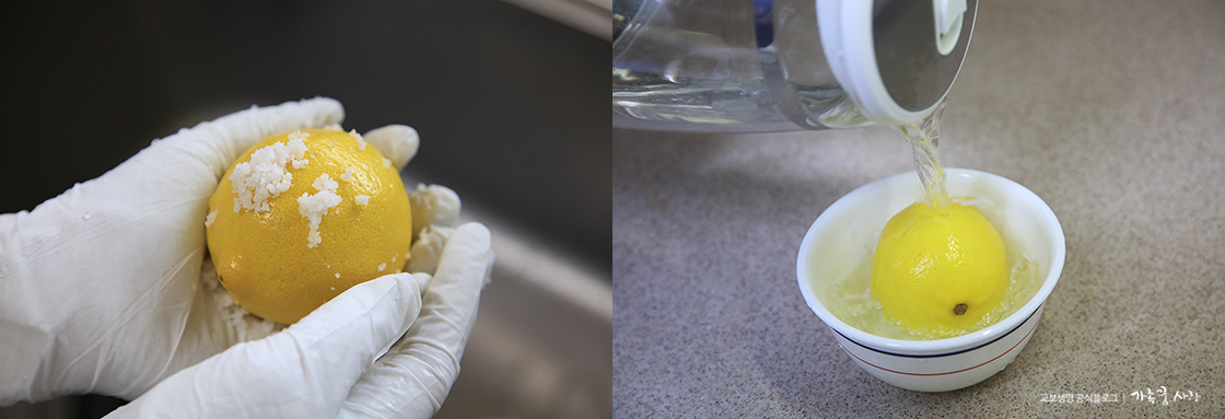 1. 레몬은 혹시 남아 있을 수도 있는 농약 성분을 제거하기 위해 굵은 소금으로 박박 문질러 닦고 깨끗하게 씻은 후 끓는 물에 몇 초 정도 담가 굴리다 꺼내 주세요. 차가운 물에 식초 한방을 떨어뜨려 헹군 후 다시 흐르는 물에 세척해 줍니다.