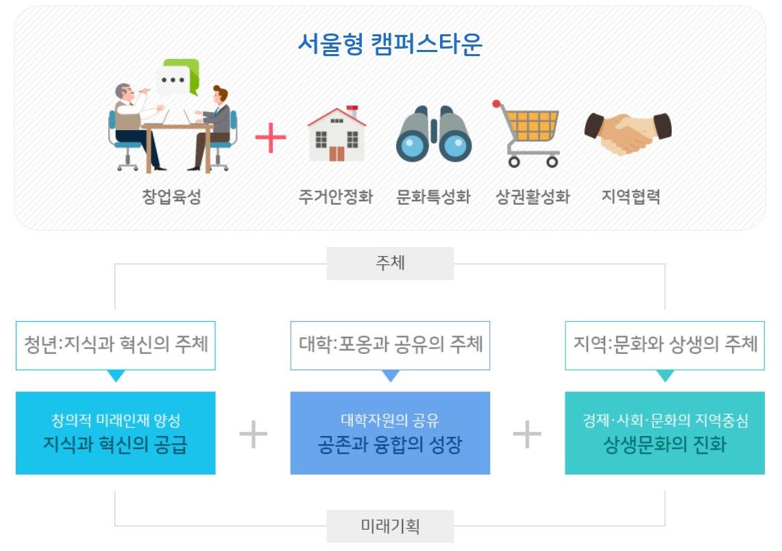 캠퍼스타운은 대학과 지역사회의 장기적 성장을 위한 서울시의 도시재생사업 중 하나입니다. 대학의 물적, 지적, 인적 자원을 활용하는 것이 핵심인데요, 공공자원과 지역 간의 협력을 이끌어내 일자리를 만들고, 지역 경제에 활력을 불어넣는 효과를 가져오는 것이 목표입니다. 한마디로 청년과 지역사회에 활력을 불어넣어 살기 좋은 마을을 만드는 것이죠. 서울시는 2016년 고려대학교와 시범사업을 시작한 이후, 2017년부터 공모를 통해 대학을 선정하고 있습니다.