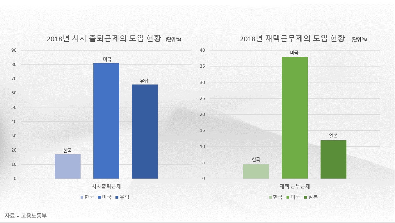 사실 유연근무제는 코로나 사태 훨씬 이전부터 존재하고 있던 근무 방식이었고, 전세계에는 유연근무제를 활용하는 기업들이 많습니다. 한국의 경우 다른 국가들에 비해 유연근무제 도입률이 낮았는데요, 한국에 유연근무제의 도입이 처음 논의된 것은 24년 전입니다. 고용노동부가 지난해 발표한 조사에 따르면 가장 많이 도입된 유연근무제는 시차 출퇴근제였고, 도입 비율은 17.2%에 그쳤습니다. 미국의 경우 시차 출퇴근제의 도입률이 81%이며 유럽의 경우 66%인 것을 미루어 보았을 때 무척 낮은 수치인 것을 알 수 있습니다.