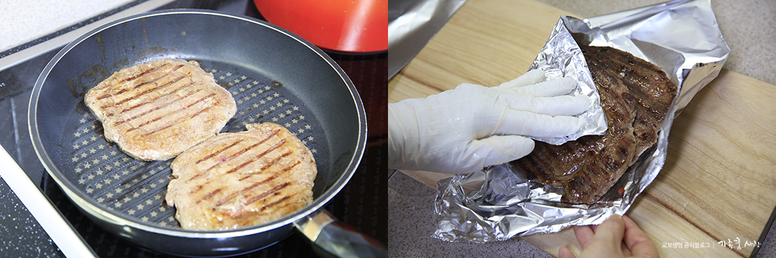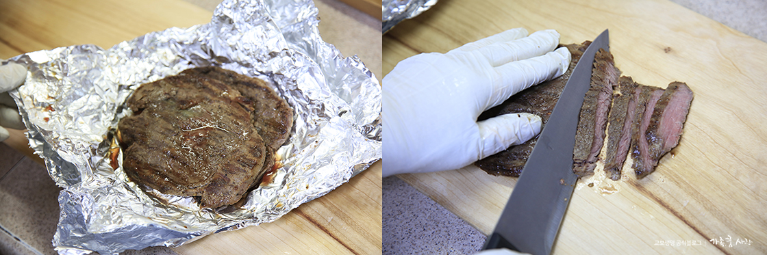 4. 알맞게 익은 고기는 호일에 싸서 레스팅 시간을 가집니다. 이 과정을 거쳐야 고기가 더 연하고 맛있어요.