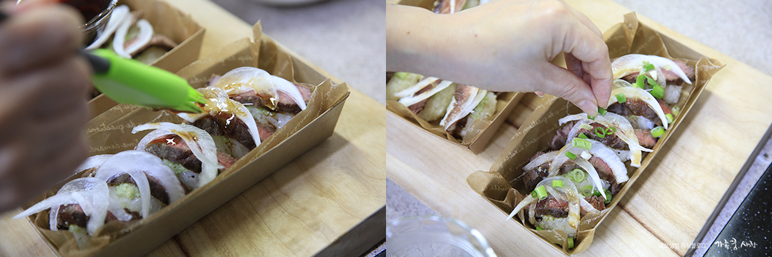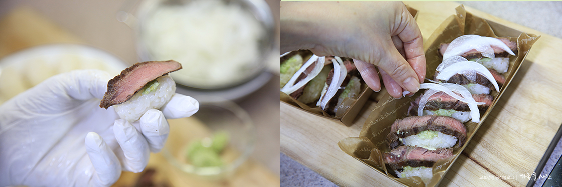 9. 초밥 위에 와사비를 올리고 그 위에 고기를 올린 후 도시락 그릇에 담아 주세요. 그 위로 슬라이스한 양파를 올려 줍니다.