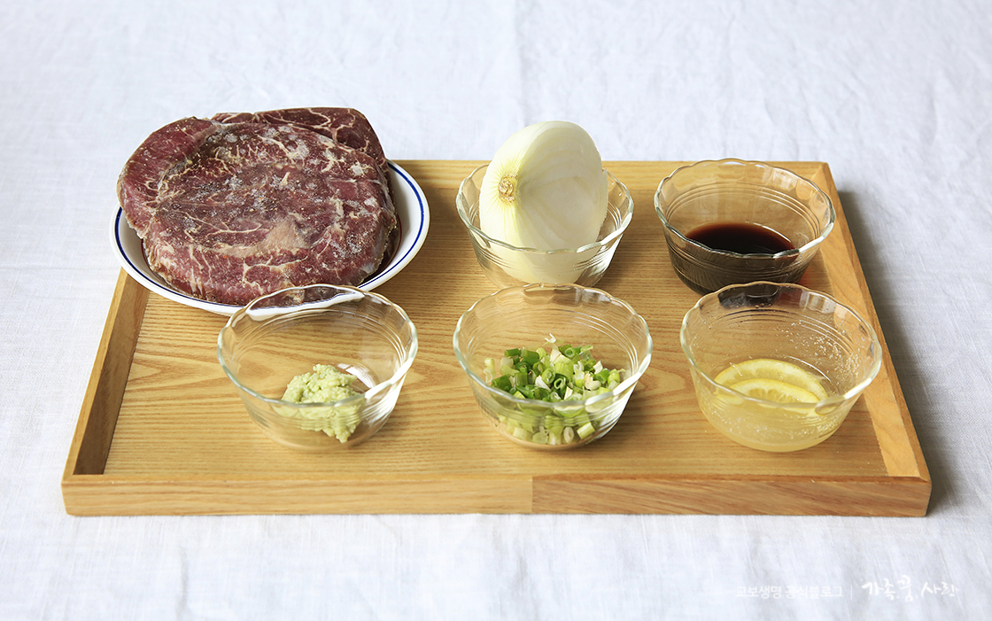 준비 재료: 스테이크용 소고기 400g(2조각), 양파 1/2개, 데리야끼소스 3스푼, 와사비, 쪽파 약간