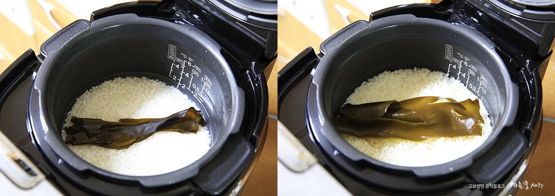 1. 쌀 2인분을 씻어 평소보다 물을 적게 넣고 다시마 한 조각을 넣고 밥을 지어 주세요. 고슬고슬하게 밥이 다 되면 다시마를 건져 냅니다.