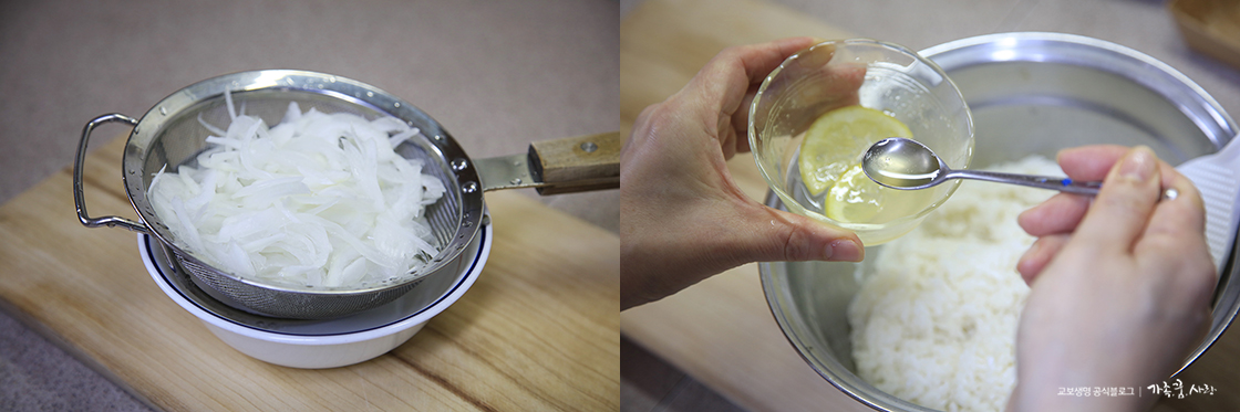 5. 슬라이스한 양파는 체에 건져 물기를 빼 주세요.