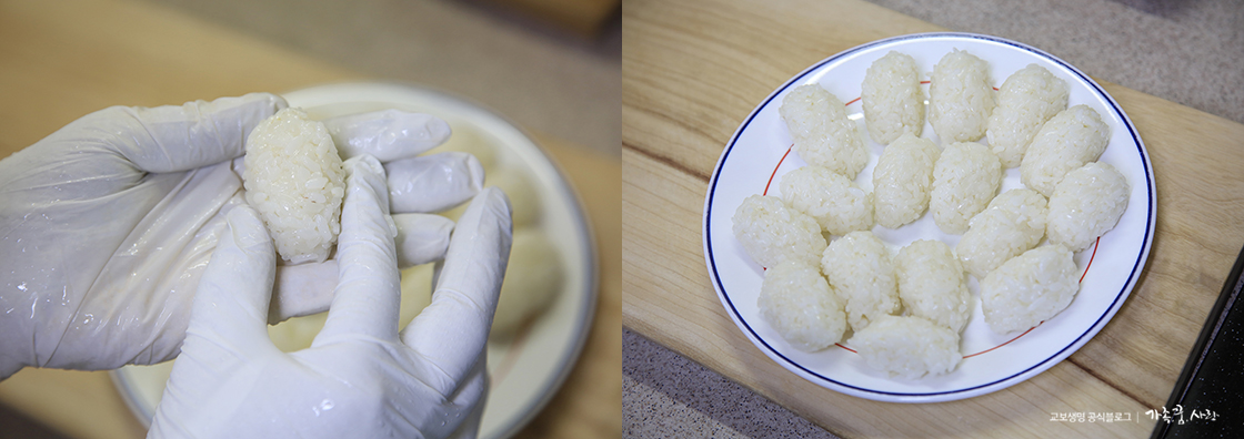 7. 알맞은 크기로 밥을 뭉쳐 초밥 모양으로 만들어 주세요.