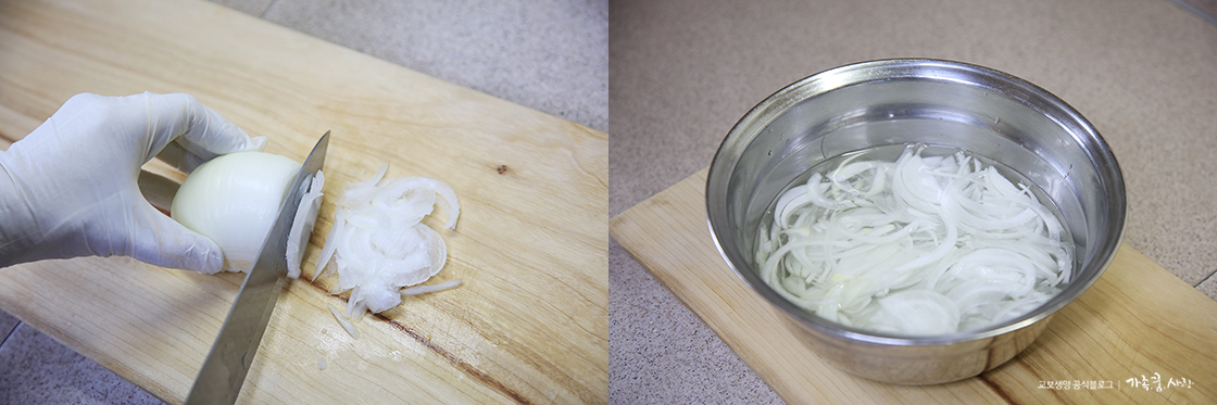 2. 양파는 최대한 얇게 슬라이스하고, 찬물에 담가 매운맛을 없애 줍니다.