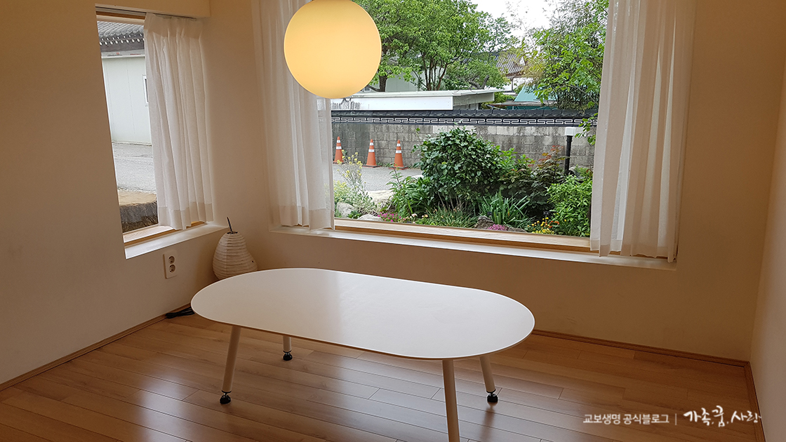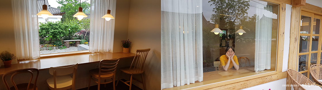 너울집의 특징이 있다면 테이블이 있는 공간마다 이렇게 커다란 창이 있다는 점입니다. 고즈넉한 한옥 마을의 자연경관이 한 폭의 그림처럼 보이더라고요.