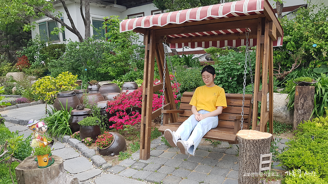 정원에는 아이들이 좋아하는 흔들그네도 있어 그네에 앉아 잠시 사색에 잠겨 보았어요. 너울집은 SNS를 통해 소문이 나기 시작해서 방문객이 늘고 있답니다. 예쁜 사진을 많이 찍고 마음에 드는 자리를 선점하고 싶다면, 방문을 서두르세요.