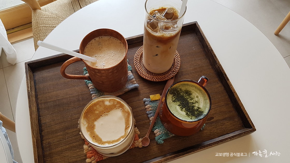 너울집의 시그니처 커피인 너울 크림라떼는 고소한 인절미크림 덕분에 매우 부드럽고 진한 맛이었어요. 달달한 커피를 별로 즐기지 않는데도 먹을 만하더라고요. 딸 아이가 선택한 쑥라떼는 정말이지 너무 맛있다는 감탄사를 쏟아낸 메뉴였습니다. 적당한 쑥 향이 어우러진 고소한 맛인데다 카페인이 들어가지 않아서 아이들 마시기에 좋았어요.