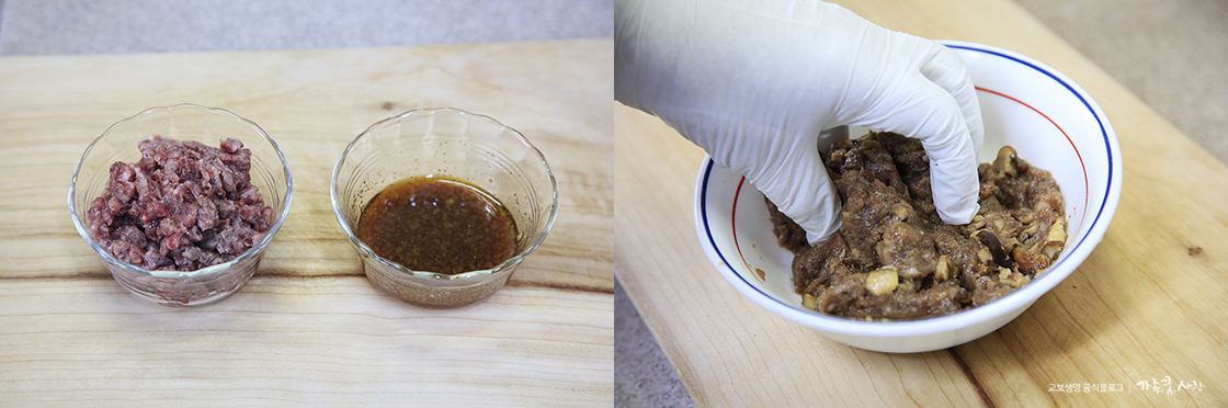 2. 다짐육 양념장과 다짐육, 그리고 1번의 다진 표고버섯을 한 데 넣고 양념이 잘 배도록 조물조물 무쳐 줍니다.