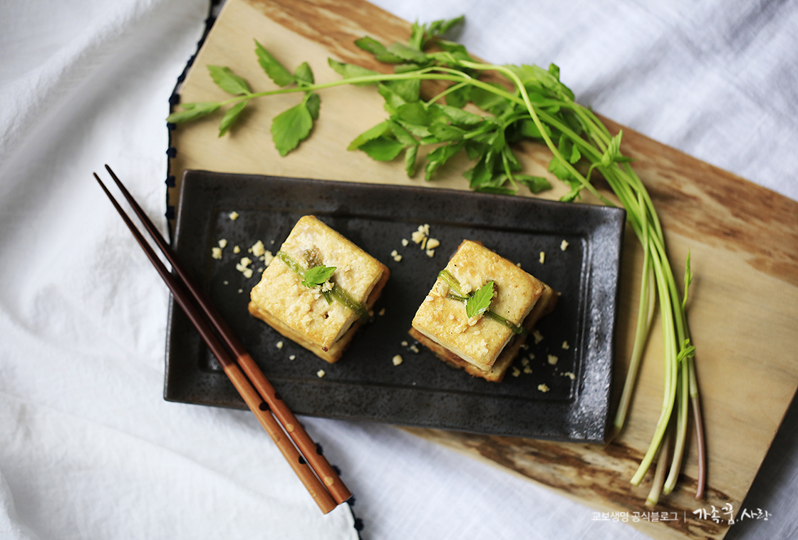 미나리는 두부완자샌드조림을 고정시키는 역할을 하는데요, 김이나 쪽파 등으로 고정 시켜도 되지만 요즘 제철인 미나리를 사용하면 풍부한 영양은 물론, 은은한 미나리 향까지 더해져 더 맛나답니다.