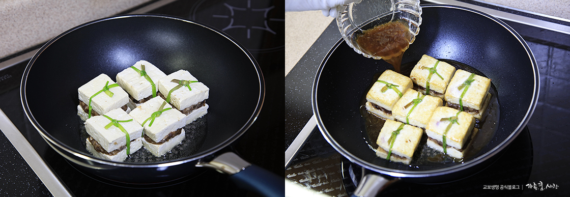 10. 달군 팬에 기름을 두르고 두부의 겉면을 노릇노릇 부쳐 주세요. 두부가 어느 정도 노릇하게 부쳐지면 조림장을 붓고 보글보글 끓여 줍니다. 끓는 동안 양념장 국물을 스푼으로 떠서 위쪽을 계속 적셔 주세요. 약불에서 국물이 자작해질 때까지 조려 주면 완성입니다.