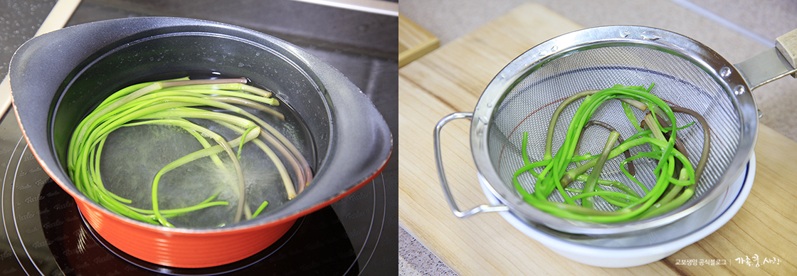 4. 물에 소금 1티스푼을 넣고 팔팔 끓으면 미나리를 넣고 10초 정도 살짝 데친 후 찬물에 헹궈 물기를 빼 줍니다.