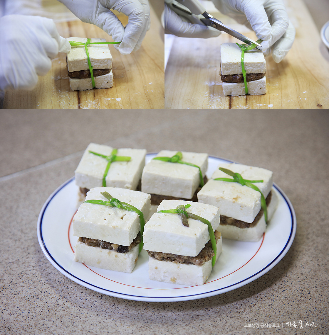 8. 데친 미나리로 두부를 고정시켜 묶고, 가위로 길이를 예쁘게 정리해 줍니다.