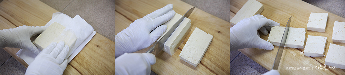5. 키친타월을 이용해 두부의 물기를 제거한 후, 도톰하게 직사각형으로 썰어 주세요. 직사각형은 다시 반으로 잘라 줍니다.