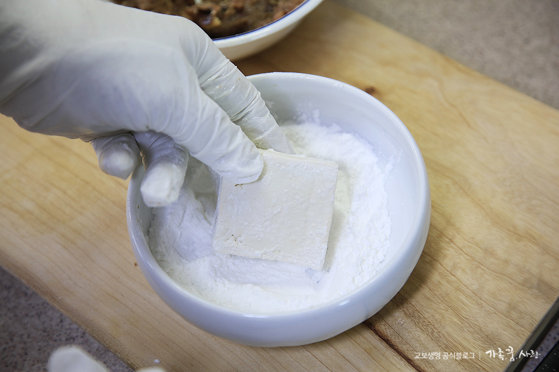 6. 사각형 모양으로 자른 두부의 앞뒤 면에 전분가루를 발라 주세요.