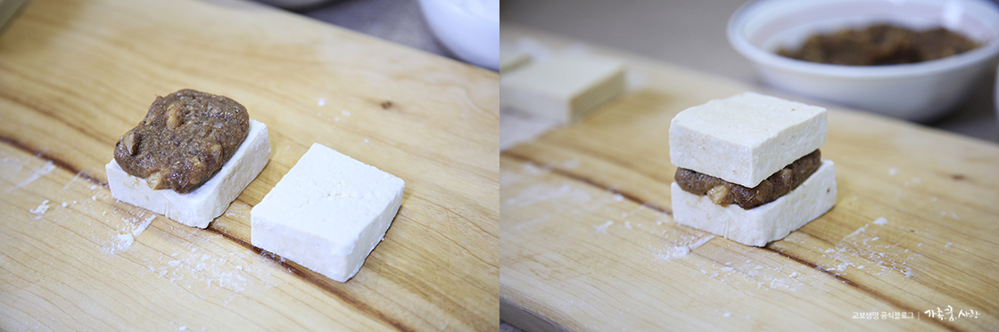 7. 미리 양념해 둔 다짐육을 두부 모양대로 납작하게 만들어 두부 위에 올리고, 그 위에 다시 두부를 올려 주세요.