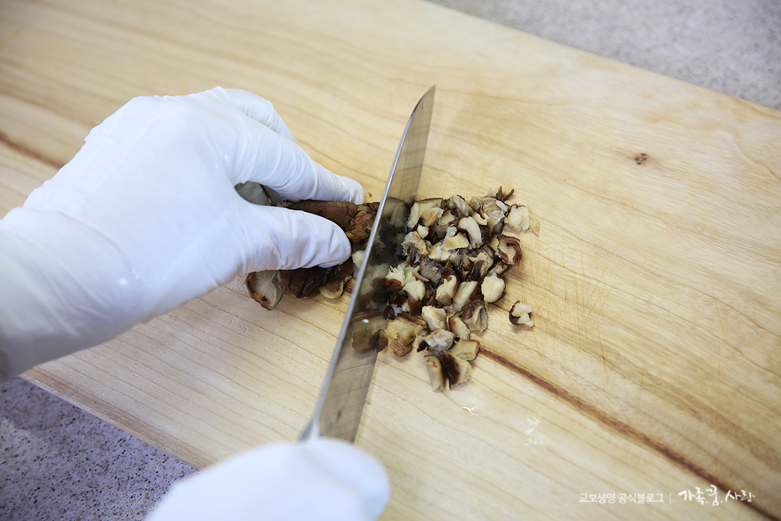 1. 마른 표고버섯을 물에 불려 물기를 꼭 짠 후, 곱게 다져 주세요.