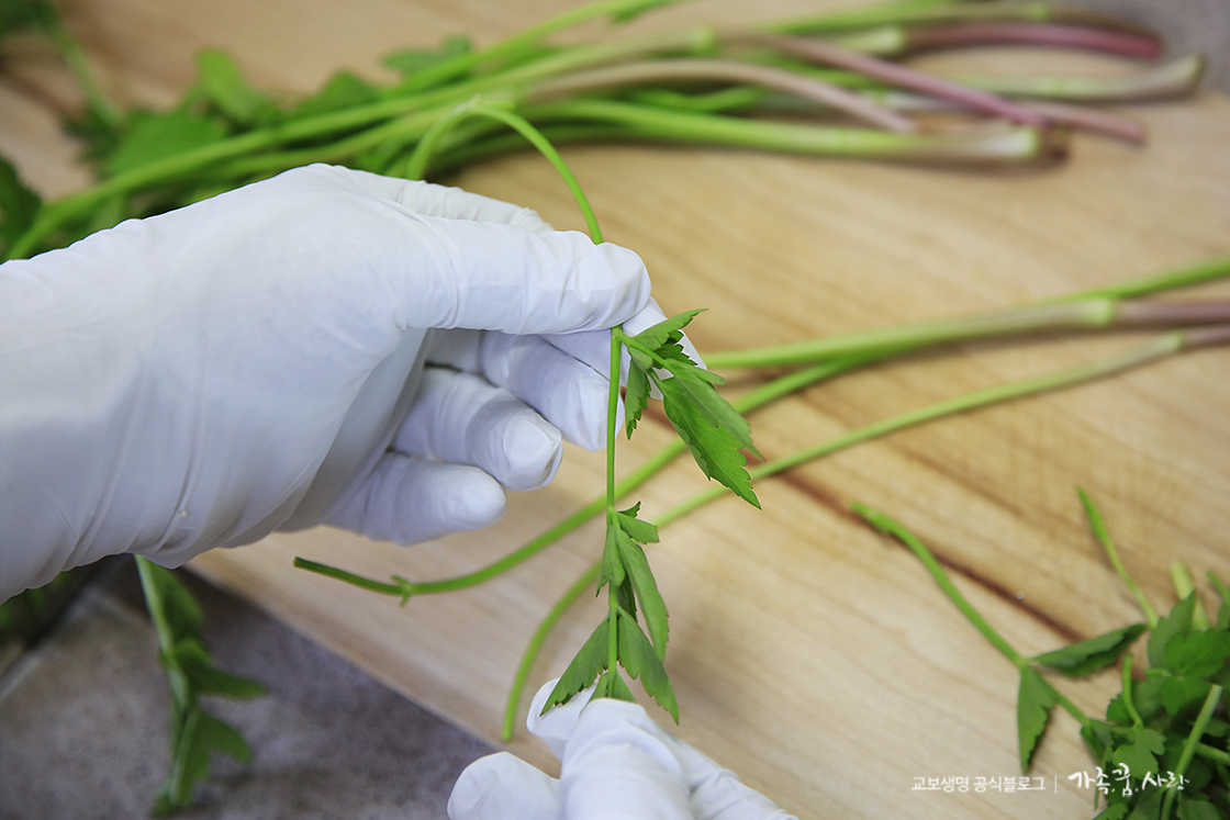 3. 미나리는 흐르는 물에 씻은 후 잎을 떼어내 주세요.