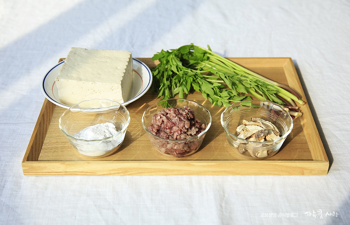 준비 재료: 두부 한 모, 미나리 10줄, 전분가루 2스푼, 소고기 다짐육 130g, 마른 표고버섯 약간