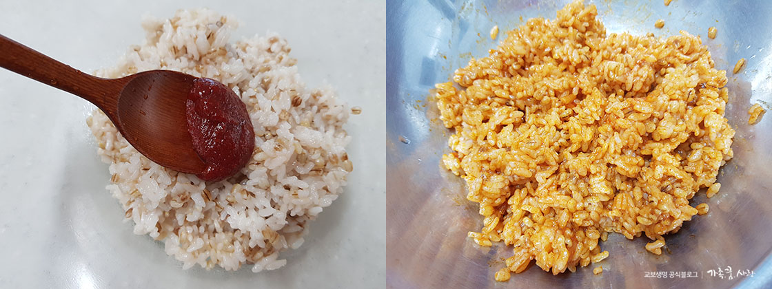 열무비빔밥은 보리밥 짓기부터 시작합니다. 구수하고 톡톡 터지는 식감이 아삭한 열무와 잘 어울려요. 밥이 다 되면 고추장과 참기름을 넣고 먼저 비벼 줍니다. 열무를 한데 넣고 비비면 아삭한 식감이 사라지고 풋내가 날 수 있어요.