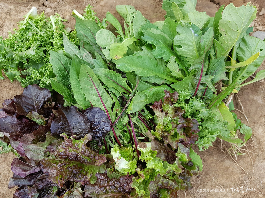 드디어 첫 수확! 양은 우리가족 한끼 분량밖에 되지 않지만 너무나 뿌듯합니다. 이만큼 키우기까지 이틀에 한 번은 밭에 와서 물을 주고, 웃거름도 주면서 온갖 정성을 기울였거든요. 마트에서 산 채소와는 비교할 수가 없지요.