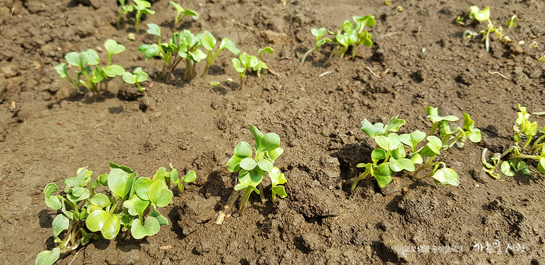 우리 텃밭의 주인공인 열무는 어떻게 되었을까요? 열무는 씨를 심은 지 일주일 정도가 지나자 땅을 뚫고 새싹이 올라왔어요. 싹이 나올 때까지는 비닐을 씌워 두고, 손톱 한 마디 정도 자랐을 때 비닐을 벗겨 냈어요. 이제는 햇빛과 물만 먹으면 잘 자랍니다.