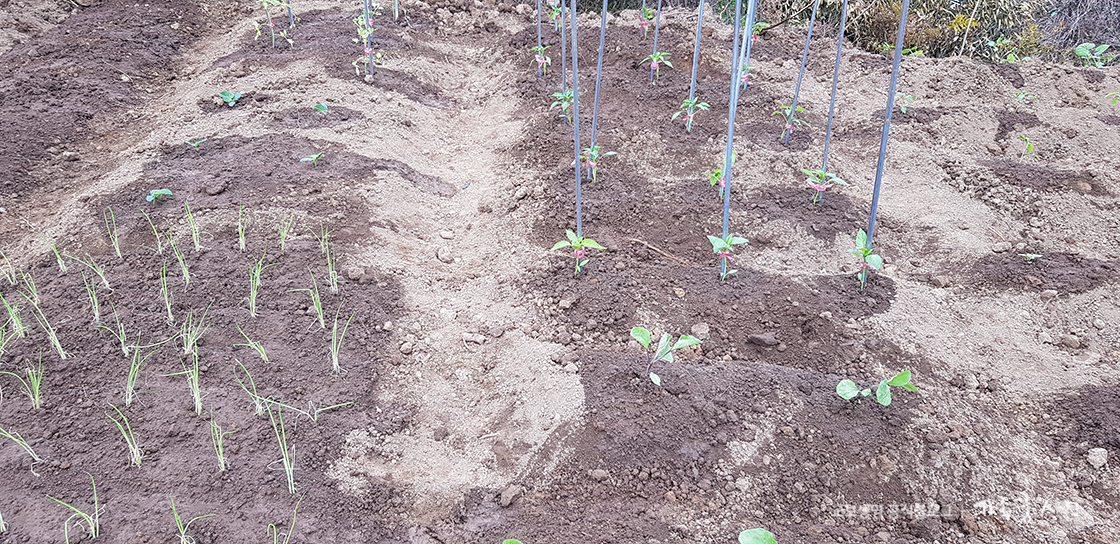 잎 채소는 간격을 두고 심어 주고, 가지와 고추, 토마토 등 줄기가 있는 채소는 지주를 세워 줍니다. 잎 채소는 어느 계절에나 키울 수 있지만 꽃이 피고 열매를 맺는 채소는 5월 5일 이후에 심는 것이 좋아요. 혹시 모를 냉해를 막기 위함이죠. 특히 올해 봄은 기온이 낮은 편이어서 열매 채소들이 얼지 않을지 노심초사했답니다.