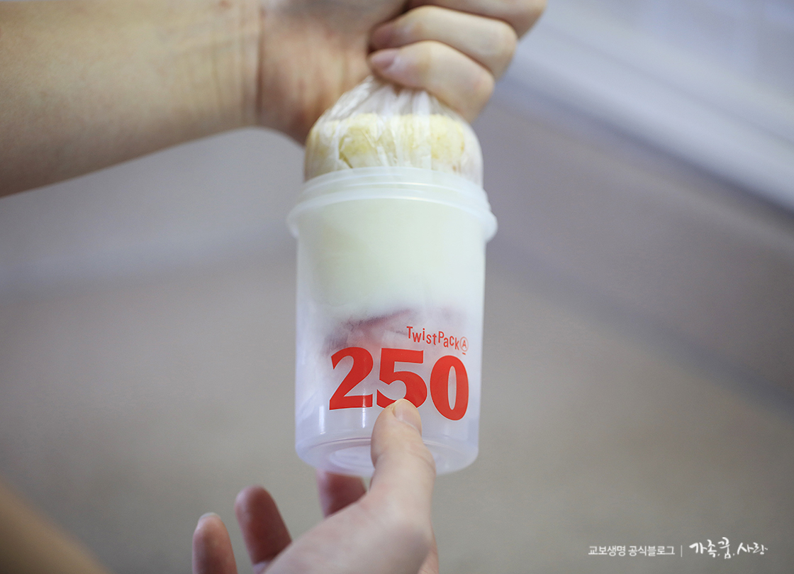 3. 용기의 2/3 정도 높이까지 요거트를 넣은 후 그 위에 카스테라를 얹어 주세요. 그리고 뚜껑을 꼭 닫아 줍니다.
