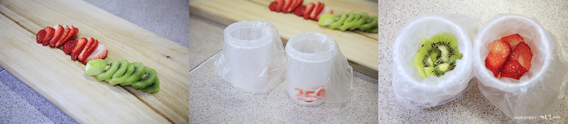 2. 딸기와 키위는 모양을 살려 납작 썰기 하고, 통에 비닐을 바닥 끝까지 잘 끼운 후 과일을 넣어 주세요. 용기에 비닐을 끼우는 이유는 냉동실에서 얼리고 난 다음 용기에서 쉽게 꺼내기 위함입니다.