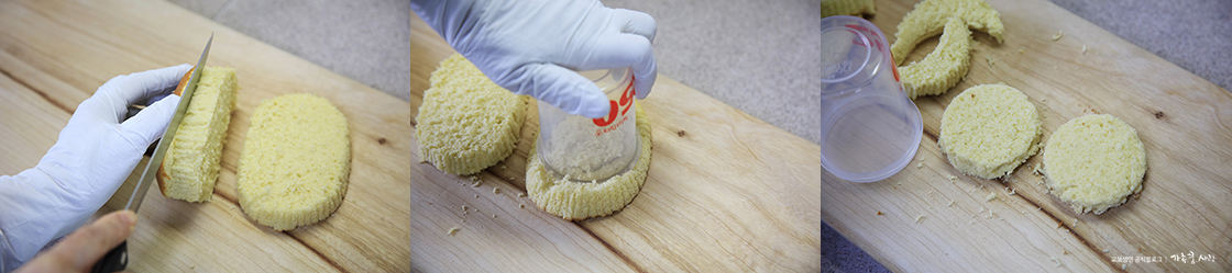 1. 먼저 카스테라를 옆으로 썬 다음, 용기로 꾹 눌러 모양을 내 주세요. 용기 안으로 들어가야 하니 자른 다음 살짝 작게 다듬어 줍니다.