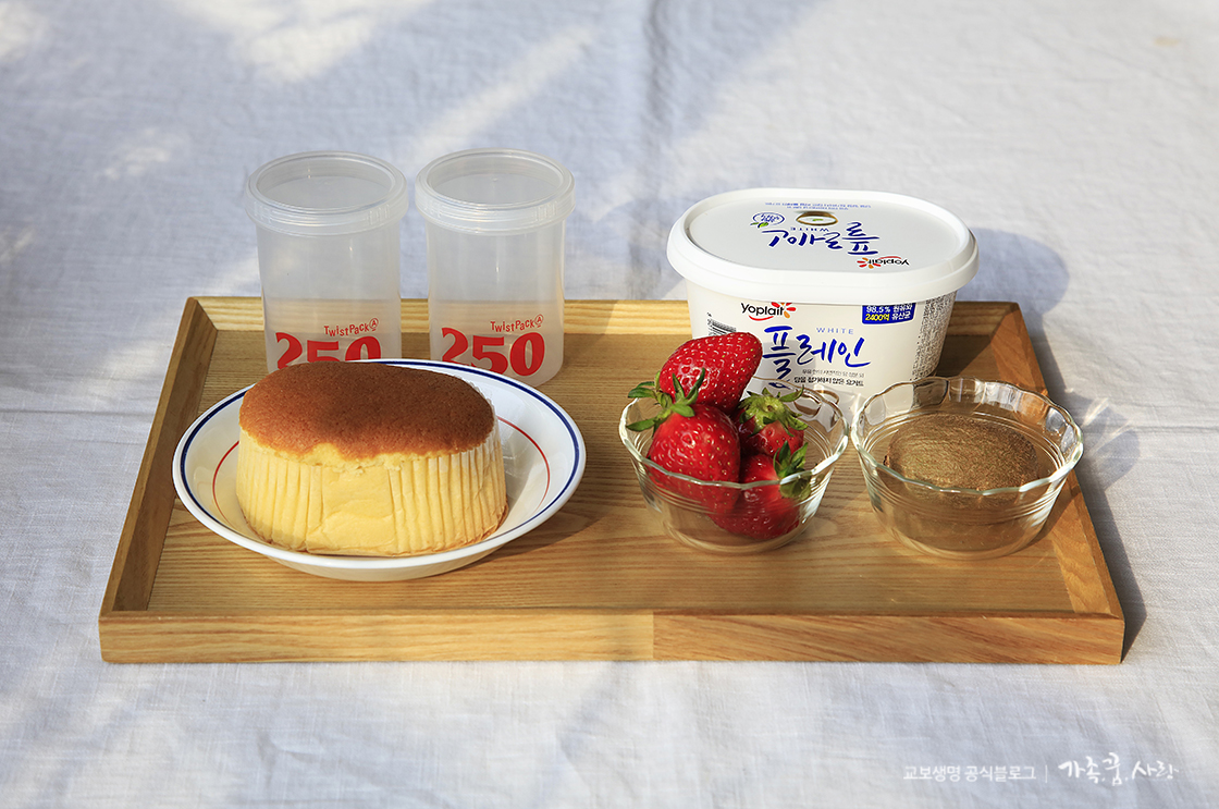 준비 재료: 플라스틱 용기 2개, 요거트 2개, 카스테라 1개, 딸기, 키위 등의 과일