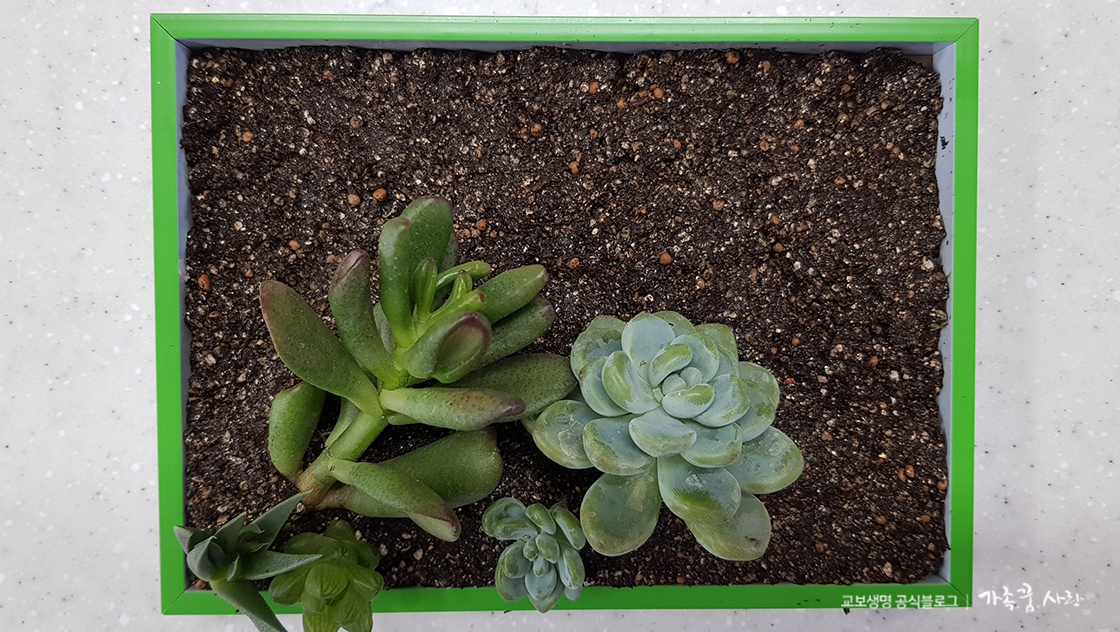넬솔과 다육식물, 액자만 있으면 준비는 끝입니다. 다육식물은 모양과 색, 크기가 각각 다른 종류로 준비하는 것이 좋습니다. 모양이 다를수록 다육액자가 더 생동감 있거든요. 크기는 액자에 넣을 수 있는 정도면 됩니다. 액자가 크거나 깊으면 거기에 맞추는 것이 좋죠. 보통 다육식물은 크지 않아서 3cm 정도 되는 깊이 액자도 충분합니다.