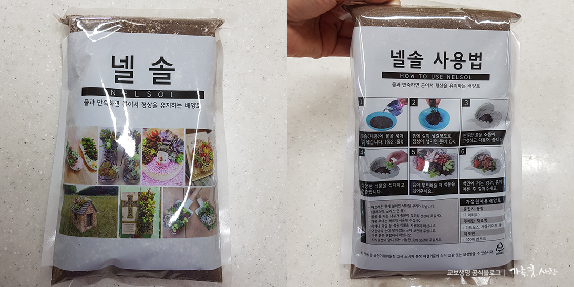 액자나 시계, 작은 소품에 심어진 다육식물을 보신 적 있으신가요? 화분이 아닌 곳에서 흙이 어떻게 움직이지 않고 고정되나 궁금해하는 분들이 많을 텐데요, 그 비밀은 바로 넬솔이라는 접착성 배양토입니다. 넬솔은 물과 반죽하면 점토처럼 뭉쳐지면서 접착성이 생깁니다. 다육 공예 전문용으로 개발된 특수제품이죠.