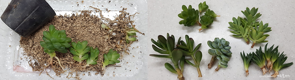 이제 다육식물을 다듬어 줄 차례입니다. 심기 편하도록 다육식물 잔뿌리를 제거해주세요. 다육식물은 잎 하나를 흙에 꽂아 두어도 뿌리가 날 정도로 번식이 왕성하기 때문에 과감하게 손질해도 됩니다. 뿌리 다듬는 게 신경 쓰이면 넬솔 반죽 전에 다육식물을 먼저 다듬는 게 좋습니다. 넬솔 반죽이 굳어버리면 안 되니까요.