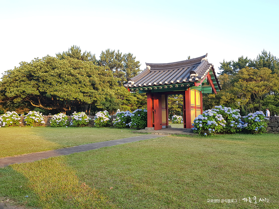 마지막으로 소개할 수국 명소는 성산읍 온평리에 있는 혼인지 수국정원입니다. 혼인지는 제주에 전해내려오는 신화 속 장소입니다. 신화 속 혼인지는 삼성혈에서 태어난 탐라의 세 신이 벽랑국에서 동쪽 바닷가로 떠밀려온 함 속의 세 공주와 혼례를 올린 곳입니다.
