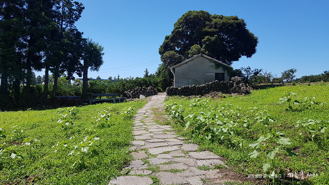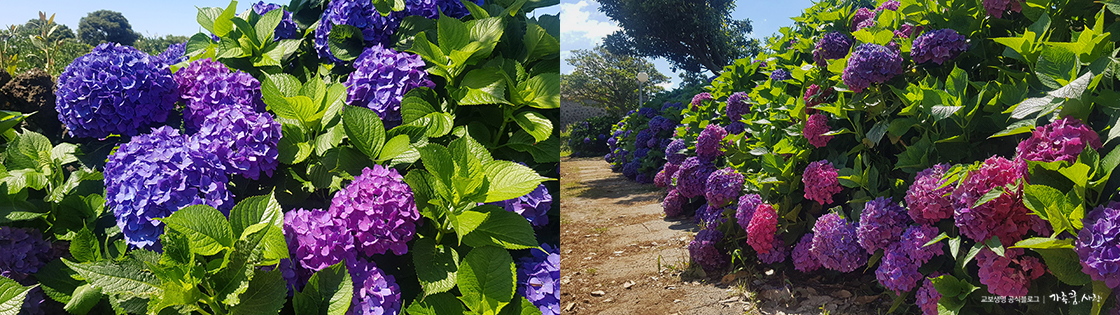 감귤밭 사이 돌담길을 따라 200미터 정도 되는 산책길에 수국이 가득 심어져 있습니다. 어른 얼굴보다 더 큰 수국들이 풍성하게 꽃을 피우고 있는 모습이 장관입니다. 야생 그대로의 생명력을 담고 있는 수국과 제주의 돌담, 감귤밭이 어우러진 풍경은 이곳에서만 느낄 수 있는 특별한 볼거리입니다.