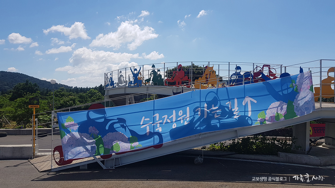 번개과학체험관 주차장에 다락 카페 수국정원으로 가는 구름다리가 있습니다. 체험관에 주차를 한 후 이 구름다리를 건너면 멋진 수국 산책길이 펼쳐집니다.