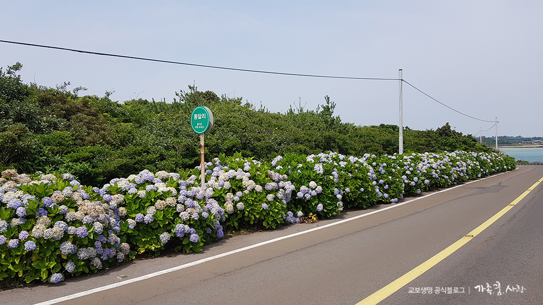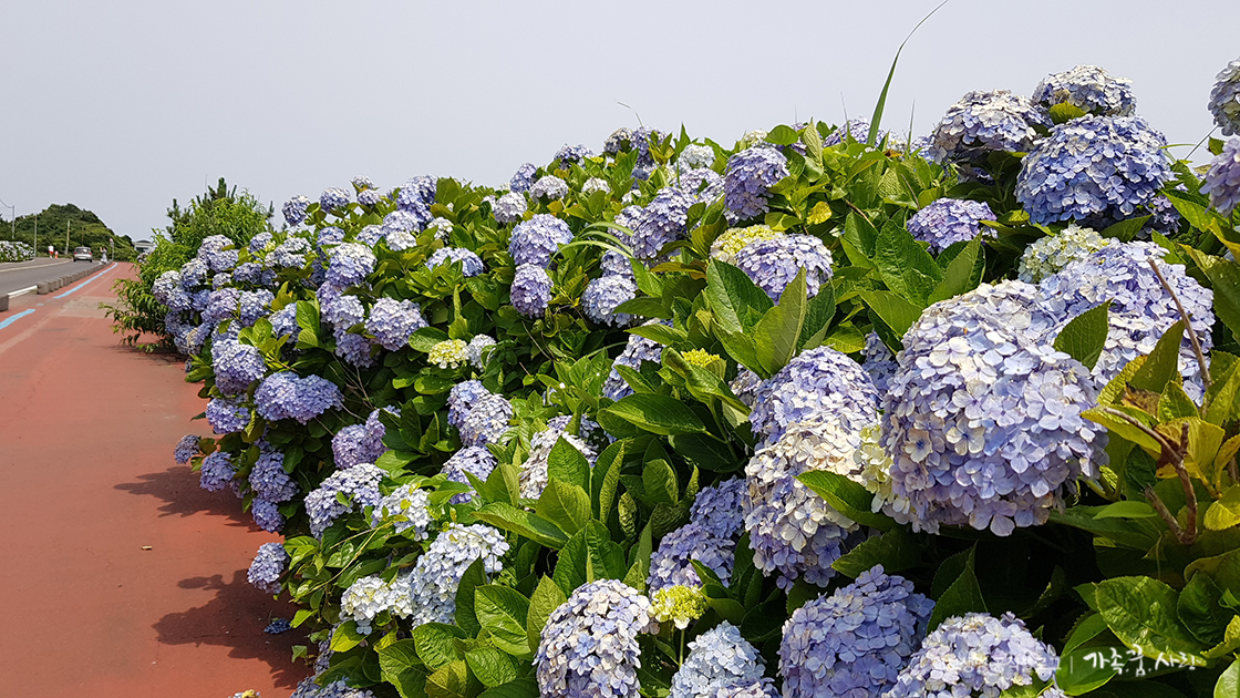 제주 수국길로 가장 먼저 명성을 쌓은 곳은 종달리 수국길입니다. 김녕해수욕장에서 성산 방향으로 해변도로를 달리다 보면 종달리 버스 정류장부터 도로 양쪽으로 수국길이 펼쳐집니다.