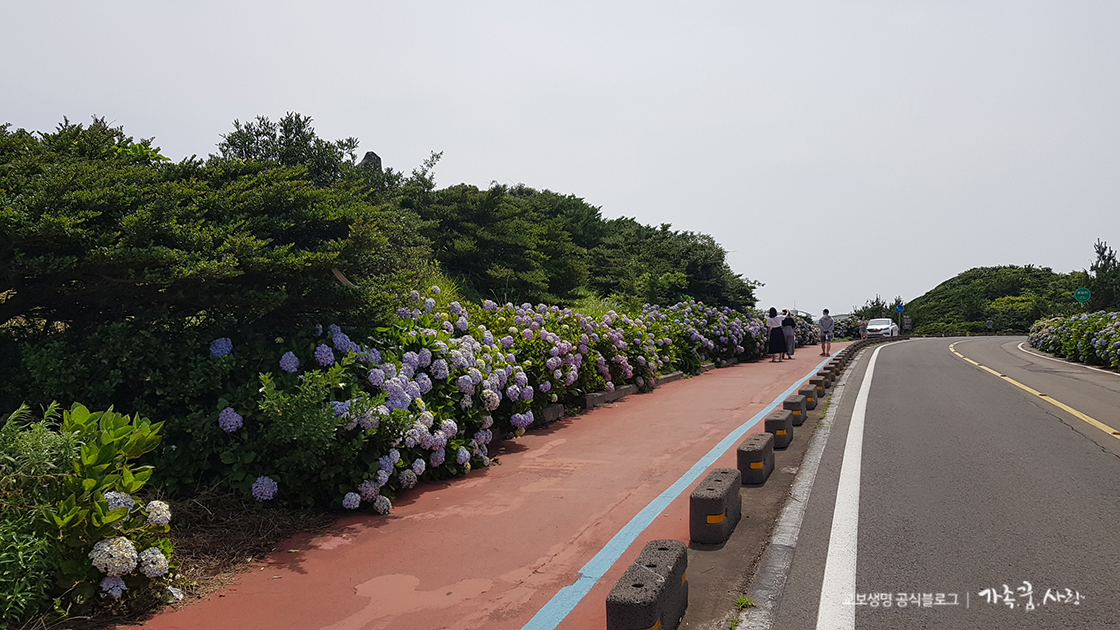 종달리 수국길은 자동차길이라서 조금 위험해 보이는데 한쪽길에 자전거 도로 겸 인도를 만들어서 보기보다는 안전합니다. 차에서 내려 사진도 찍고, 가까이서 수국을 감상하기 좋죠. 이맘때 이 이곳 해안도로는 대부분 수국을 보러 오는 관광객으로 가득해 서로 양보하면서 조심스럽게 운전하는 모습을 많이 볼 수 있습니다.