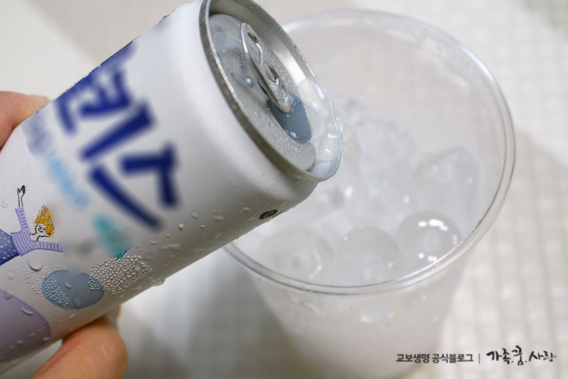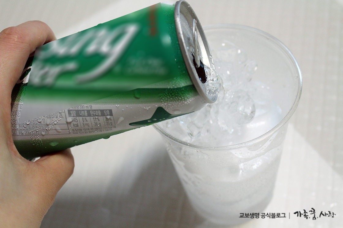 1. 얼음컵에 사이다를 40% 정도 넣어줍니다. 저는 탄산을 즐기는 편이 아니라 40% 넣어주었는데 탄산 좋아하시는 분들은 취향껏 더 넣어주셔도 좋습니다.