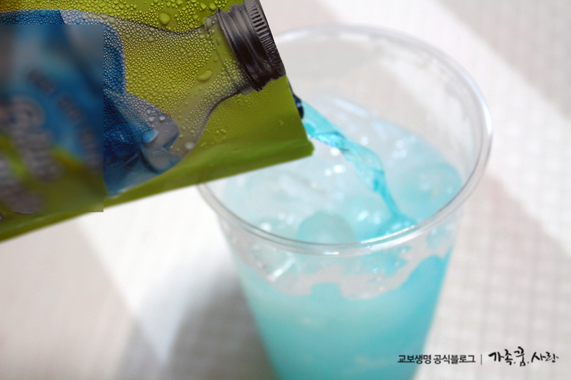 2. 다음으로 블루레몬에이드를 넣어주세요. 밀키스와 만나면 부드럽고 오묘한 파란색으로 변한답니다.