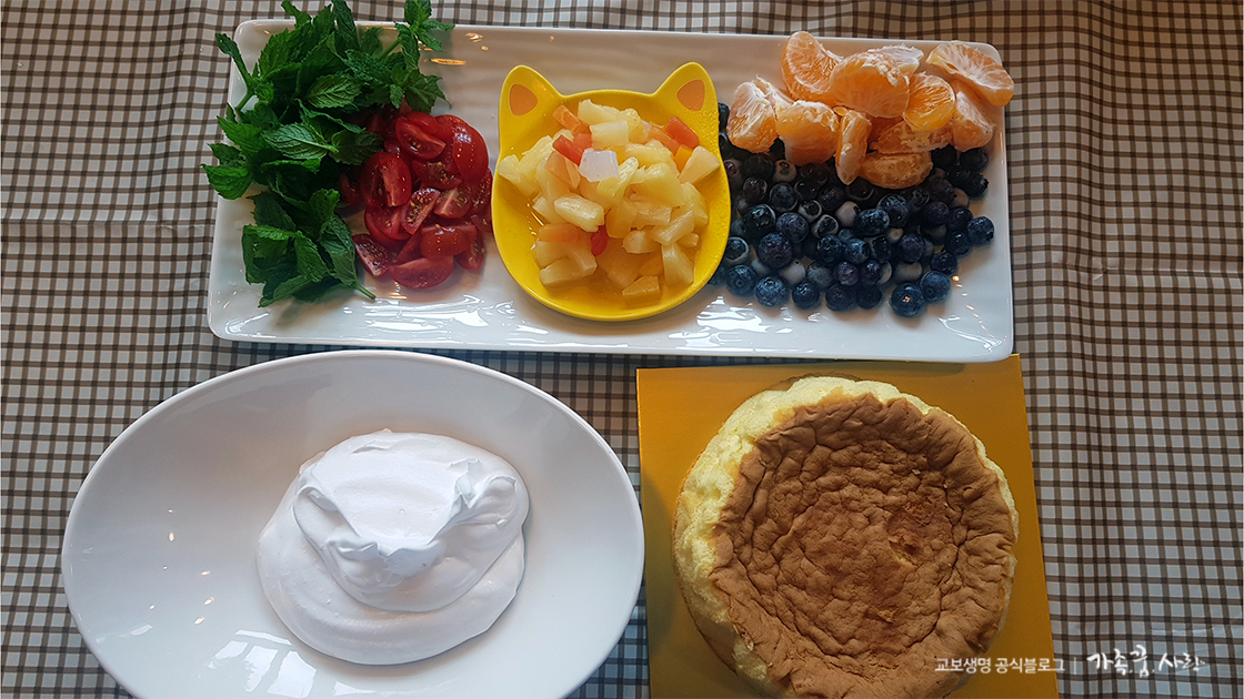 체험공방에는 블루베리 생크림 케이크를 만들 재료가 미리 준비돼 있습니다. 케익 시트와 생크림, 블루베리, 귤, 과일 칵테일, 방울토마토, 애플민트 등의 다양한 토핑이 예쁘게 세팅돼 있습니다.